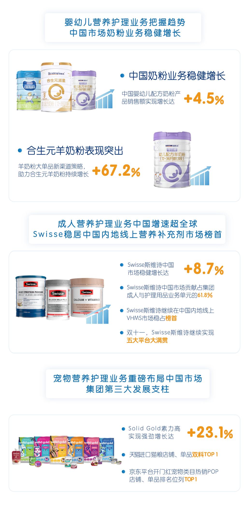 其中,嬰幼兒營養(yǎng)及護(hù)理用品業(yè)務(wù)單元(BNC)中的中國市場奶粉業(yè)務(wù)銷售額實(shí)現(xiàn)4.5%增長;成人營養(yǎng)及護(hù)理用品業(yè)務(wù)單元(ANC)銷售額全球升勢明顯,達(dá)5.8%,其中ANC中國市場增幅達(dá)8.7%;寵物營養(yǎng)及護(hù)理用品業(yè)務(wù)單元(PNC)營收達(dá)3.45億元,Solid Gold素力高同比增長達(dá)23.1%, PNC中國市場在PNC業(yè)務(wù)單元占比41.1%。