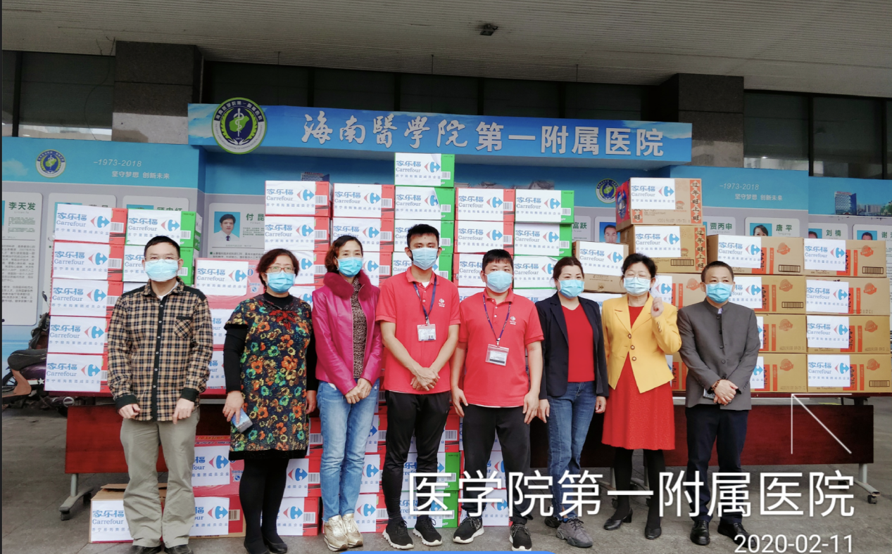 ??谔K寧家樂福于2月11日上午,向海南醫(yī)學(xué)院第一附屬醫(yī)院捐贈了一批生活方便食品,涵蓋速食面、牛奶、八寶粥、功能飲料等。