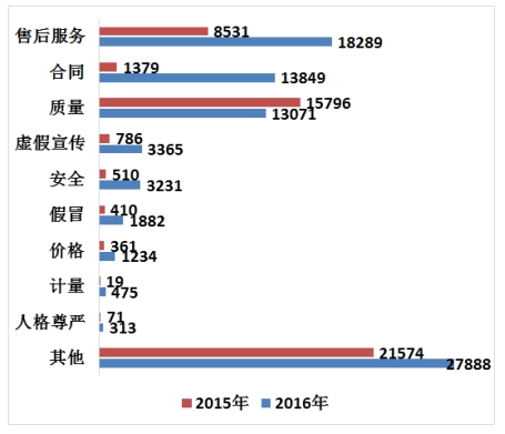 由于投訴總量的激增,相對(duì)于2015年,除質(zhì)量問(wèn)題之外,其他各類(lèi)的投訴問(wèn)題都增加,增加的幅度大多超過(guò)了1倍。如表3,圖4所示。