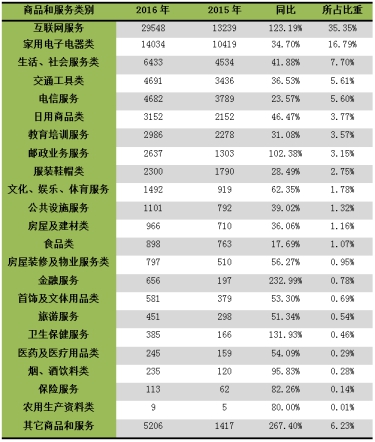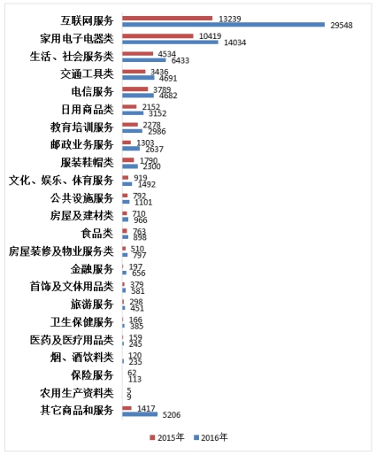 2016年商品和服務(wù)二十三大類(lèi)投訴,相對(duì)2015年數(shù)量均有所增長(zhǎng)?;ヂ?lián)網(wǎng)服務(wù)、家用電子電器類(lèi)、生活社會(huì)服務(wù)類(lèi)、交通工具、電信服務(wù)類(lèi)五大類(lèi)投訴量居前,分別占投訴總量的35.35%、16.79%、7.70%、5.61%和5.60%。