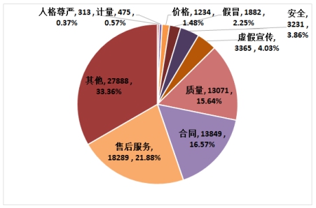 從投訴性質(zhì)看,2016年受理的投訴中,反映最突出的是售后服務(wù)問(wèn)題,18289宗,占21.88%;其次是合同問(wèn)題,13849宗,占16.57%;再就是質(zhì)量問(wèn)題,13071宗,占15.64%;三大性質(zhì)類(lèi)別的投訴比率都超過(guò)了10%。虛假宣傳問(wèn)題、安全以及假冒問(wèn)題,分別有3365宗、3231宗和1882宗,所占比率都低于5%。如圖3所示。