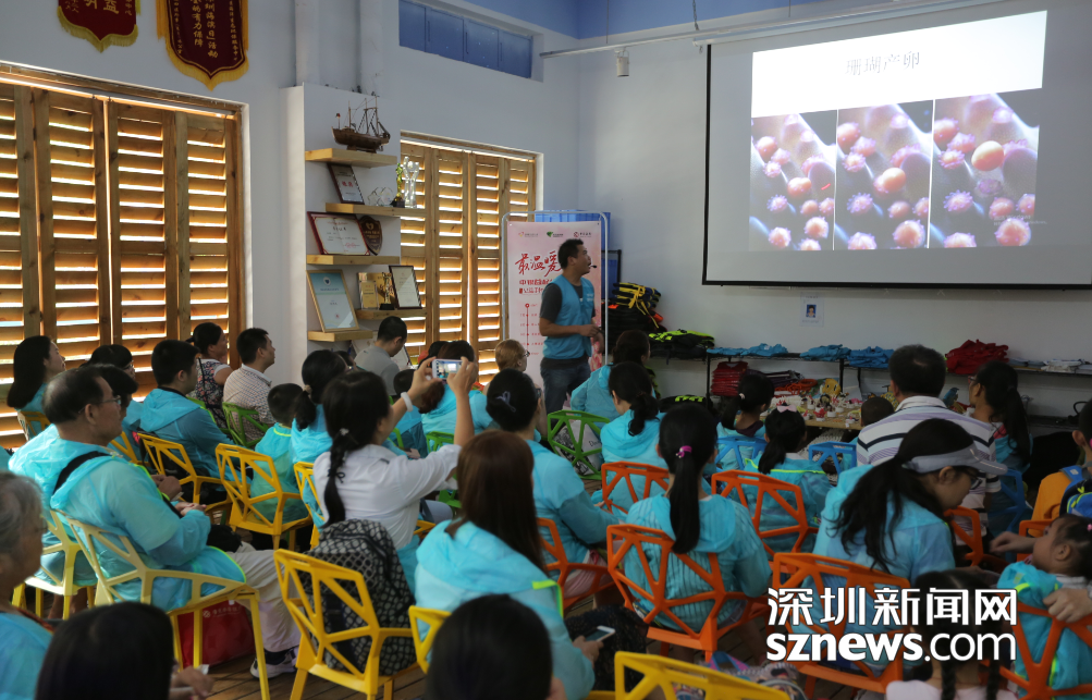 珊瑚蟲義工隊隊長鯊哥為來到海邊學(xué)習(xí)海洋環(huán)保知識的孩子們上課。