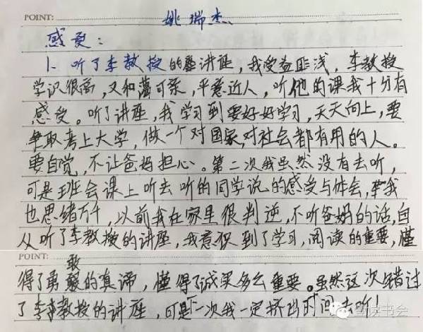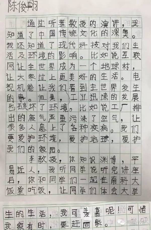 近日,多位小朋友特地就這次講座表達(dá)感想。他們紛紛盛贊講座深刻,令其受益匪淺,“深受感動(dòng)”。他們紛紛在感想里提到李教授平易近人,講課精彩,更在聽(tīng)完李教授的課后開(kāi)始反思現(xiàn)代科技與當(dāng)代生活,提升自身思想和文化水平。