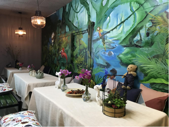 還有那漫山遍野的鮮花和蔬菜,是這個(gè)花園里最美的風(fēng)景線,還有那清晨中薄薄的霧,和那湛藍(lán)的天空,給這個(gè)花園做了最棒的裝飾,跟著香味,我走進(jìn)了一個(gè)童話房門,墻壁上畫滿了森林和動物,桌子上擺滿了各式各樣的小燈,瓶子和香氣撲鼻的鮮花、干花,香極啦!看著這仙境般的地方,臉上總會不由自主地浮起笑容!
