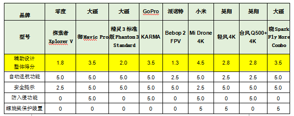 總評:小米“Mi Drone 4K”輔助設(shè)計表現(xiàn)最好,獲評4.5分。派諾特“Bebop 2 FPV”和零度“探索者Xplorer V”表現(xiàn)較差,僅獲評1.3分和1.8分。詳見下表。