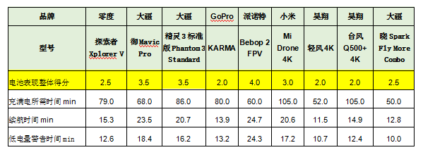 御Mavic Pro”和“精靈3標(biāo)準(zhǔn)版Phantom 3 Standard”,充電時間較短,續(xù)航時間較長,表現(xiàn)較好,獲評3.5分。