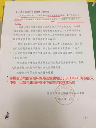 據(jù)悉,該市民在2017年已在信訪局上針對(duì)低層油煙管道對(duì)居民區(qū)排放油煙的問題進(jìn)行投訴,當(dāng)年12月1日得到了深圳市羅湖區(qū)環(huán)境保護(hù)與水務(wù)局的回復(fù),稱羅湖區(qū)環(huán)水局已于2017年1月對(duì)相關(guān)低空排放油煙的餐廳提出了要將油煙高空排放的要求,餐廳安裝的高空煙管也已于2017年10月正式投入使用。