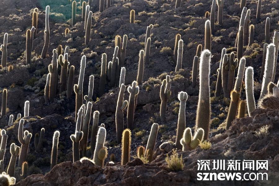 深圳新聞網(wǎng)訊 烏尤尼鹽沼中,有一個(gè)孤立的小山頭,猶如瀚海中的小島。島上長(zhǎng)滿巨大的仙人柱,據(jù)說(shuō)有的已經(jīng)生長(zhǎng)了上千年。這種形狀各異、耐鹽堿、耐干旱的熱帶植物豐富了鹽沼的風(fēng)光,構(gòu)成絕無(wú)僅有的世界奇觀。 李仁奇 攝