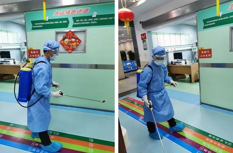 后勤人員在科室進(jìn)行消殺工作