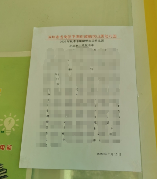 龍崗區(qū)平湖街道融悅山居幼兒園2020年秋季小班錄取名單(市民供圖)