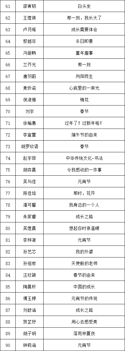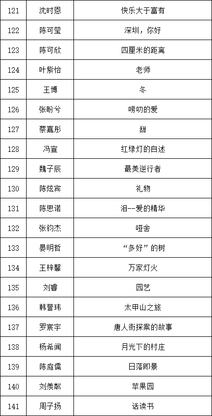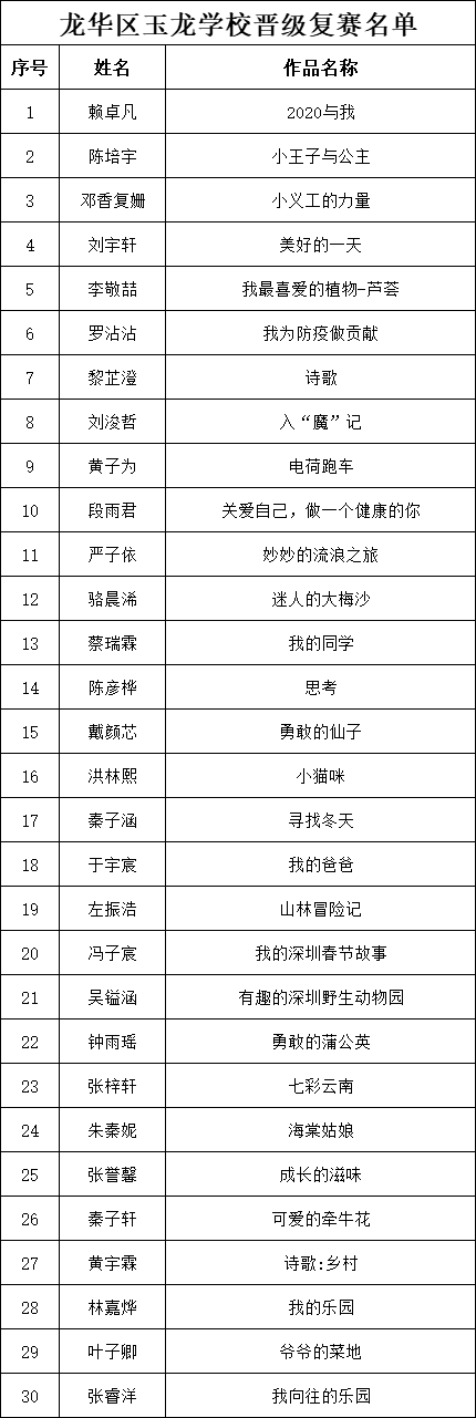 自2021年1月,活動征稿啟動以來,獲得了深圳市廣大中小學生、教師、文學愛好者的熱烈響應積極參與,吸引了深圳百余所學校的上萬人關注報名?,F(xiàn)公布龍華區(qū)玉龍學校專場晉級復賽名單如下: