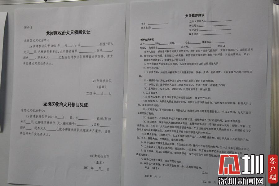 公告板張貼的犬只領回憑證和領養(yǎng)協(xié)議。