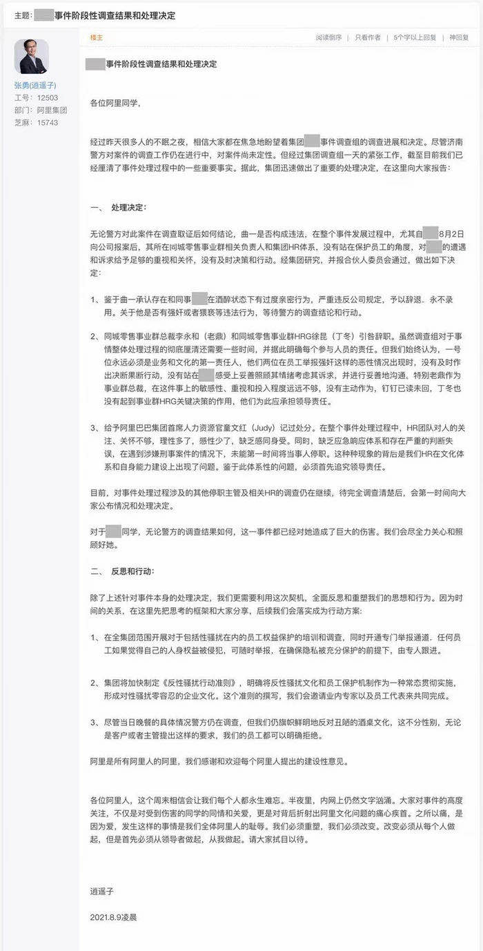 8月9日凌晨,阿里巴巴董事會(huì)主席兼CEO張勇在阿里內(nèi)網(wǎng)公布了“女員工被侵犯”的階段性內(nèi)部調(diào)查結(jié)果和處理決定。