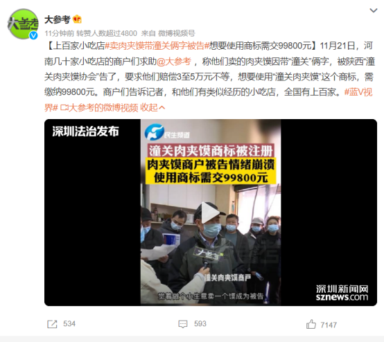 6.【法治事件】全國多個經(jīng)營肉夾饃的店家“潼關(guān)肉夾饃”這幾個字不能用了,不但要賠償給潼關(guān)肉夾饃協(xié)會3萬到5萬元不等的賠償金,要繼續(xù)用這個商標(biāo),還得向協(xié)會交99800元。11月26日,國家知識產(chǎn)權(quán)局針對“逍遙鎮(zhèn)胡辣湯”和“潼關(guān)肉夾饃”的商標(biāo)糾紛事件做了回應(yīng)。當(dāng)天,潼關(guān)肉夾饃協(xié)會就“潼關(guān)肉夾饃”商標(biāo)進行維權(quán)一事向全國潼關(guān)肉夾饃經(jīng)營者道歉。