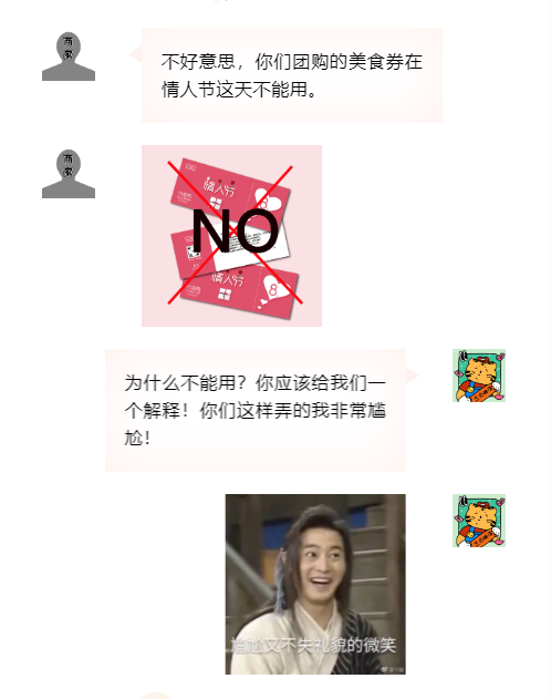 遇到春節(jié)、情人節(jié)等特殊時期,消費者在團購時應當看清使用期限,如商家未提前說明美食券的限用日期,而是去到現(xiàn)場才告知消費者不能使用,則商家涉嫌侵害消費者的知情權(quán)、公平交易權(quán)。如商家銷售美食券的頁面,注明情人節(jié)不能使用,此時商家盡到了提醒義務,消費者可在規(guī)定的其他時間內(nèi)使用美食券,或者向平臺申請退款。(消費提示:消費者購買團購券時,要仔細閱讀團購頁面的使用說明,特別是要仔細瀏覽團購券使用時限。限用人數(shù)等具體內(nèi)容,避免遭遇買了卻用不了的困境。)