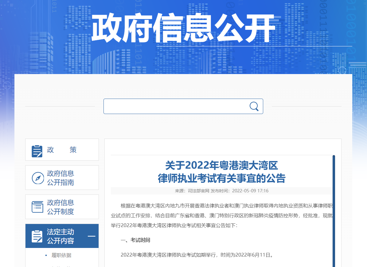 2022年粵港澳大灣區(qū)律師執(zhí)業(yè)考試內(nèi)容、成績公布及核查等事宜,按照2021年12月公布的《中華人民共和國司法部公告》(第9號)執(zhí)行。