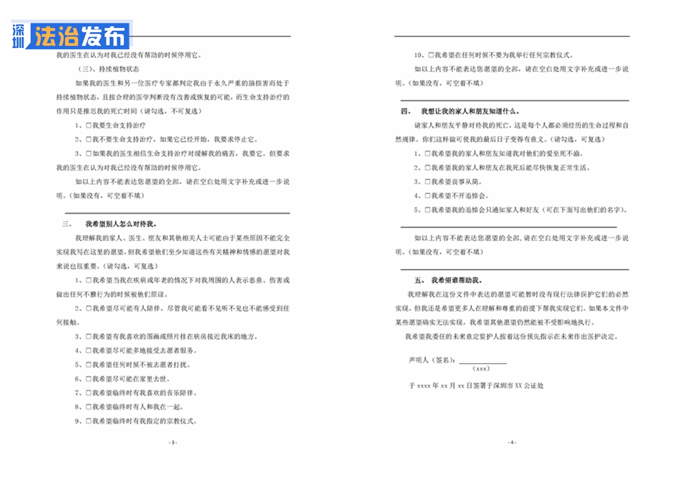 除了生前預(yù)囑的3種情況外,杜芹律師公證的這份聲明書(shū),包含5個(gè)愿望清單①我要或不要什么醫(yī)療服務(wù)②我希望使用或者不使用生命支持治療③我希望別人怎么對(duì)待我④我想讓我的家人和朋友知道什么⑤我希望誰(shuí)幫助我。