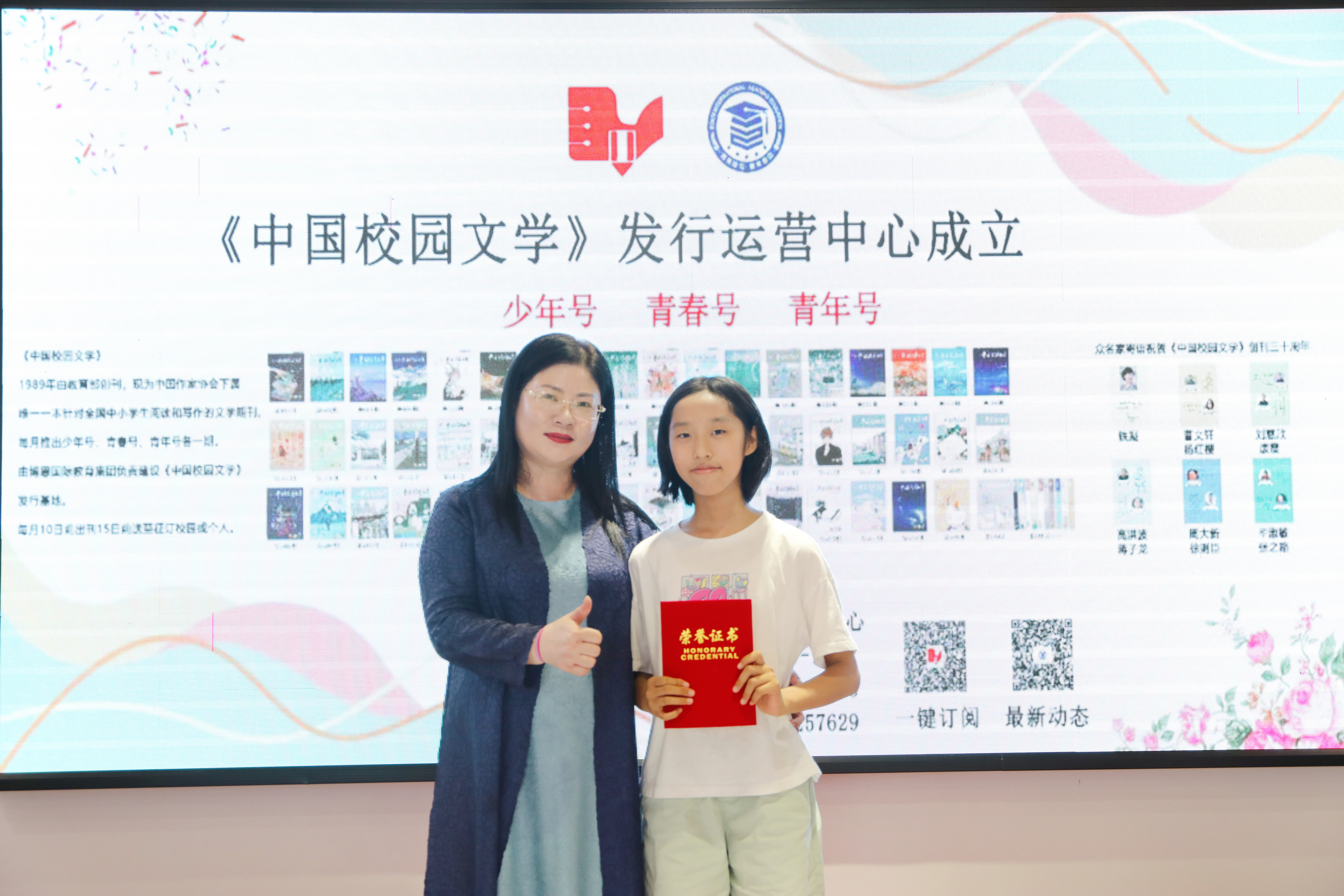 全國文學(xué)盛典聯(lián)合發(fā)起人、創(chuàng)始人肖硯寧為優(yōu)生代表頒獎并合影