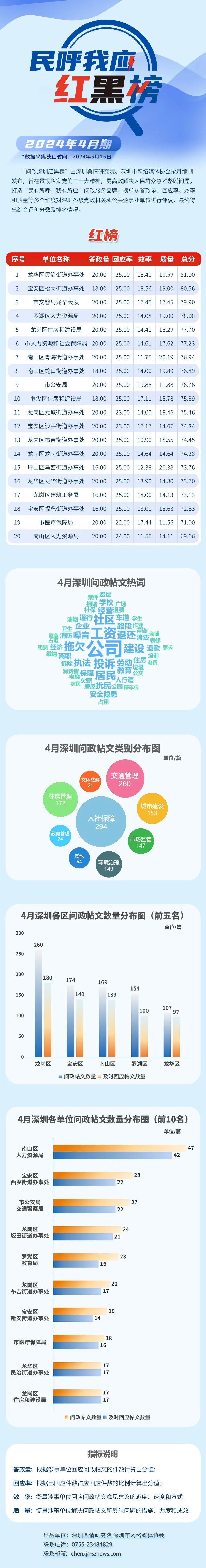 2024年4月,共有20家單位因積極解決民生問題,認(rèn)真細(xì)致答政,最終登上“紅榜”,它們分別是:龍華區(qū)民治街道辦事處、寶安區(qū)松崗街道辦事處、市交警局龍華大隊(duì)、羅湖區(qū)人力資源局、龍崗區(qū)住房和建設(shè)局、市人力資源和社會保障局、南山區(qū)粵海街道辦事處、南山區(qū)蛇口街道辦事處、市公安局、羅湖區(qū)住房和建設(shè)局、龍崗區(qū)龍城街道辦事處、寶安區(qū)沙井街道辦事處、龍崗區(qū)布吉街道辦事處、龍崗區(qū)龍崗街道辦事處、坪山區(qū)馬巒街道辦事處、龍華區(qū)龍華街道辦事處、龍崗區(qū)建筑工務(wù)署、寶安區(qū)福永街道辦事處、市醫(yī)療保障局、南山區(qū)人力資源局。