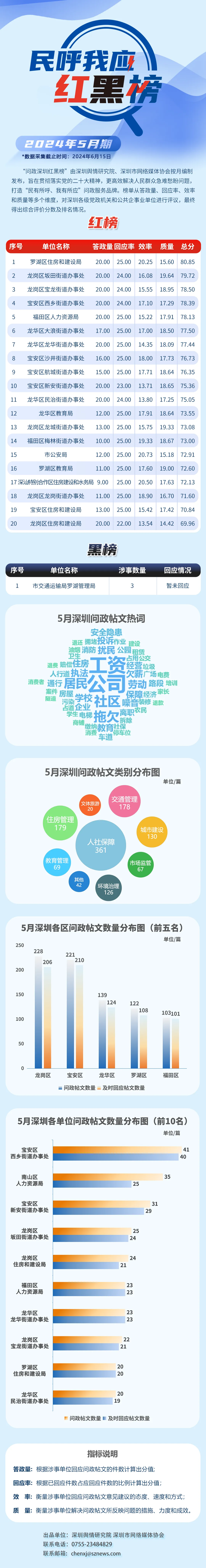 2024年5月,共有20家單位因積極解決民生問題,認真細致答政,登上“紅榜”,它們分別是:羅湖區(qū)住房和建設(shè)局、龍崗區(qū)坂田街道辦事處、龍崗區(qū)寶龍街道辦事處、寶安區(qū)西鄉(xiāng)街道辦事處、福田區(qū)人力資源局、龍華區(qū)大浪街道辦事處、龍華區(qū)龍華街道辦事處、寶安區(qū)沙井街道辦事處、寶安區(qū)航城街道辦事處、寶安區(qū)新安街道辦事處、龍華區(qū)民治街道辦事處、龍華區(qū)教育局、龍崗區(qū)龍城街道辦事處、福田區(qū)梅林街道辦事處、市公安局、羅湖區(qū)教育局、深汕特別合作區(qū)住房建設(shè)和水務(wù)局、龍崗區(qū)龍崗街道辦事處、寶安區(qū)住房和建設(shè)局、龍崗區(qū)住房和建設(shè)局。另外,市交通運輸局羅湖管理局因相關(guān)帖文回應(yīng)率偏低,整體答政效果不佳,被列入“黑榜”。