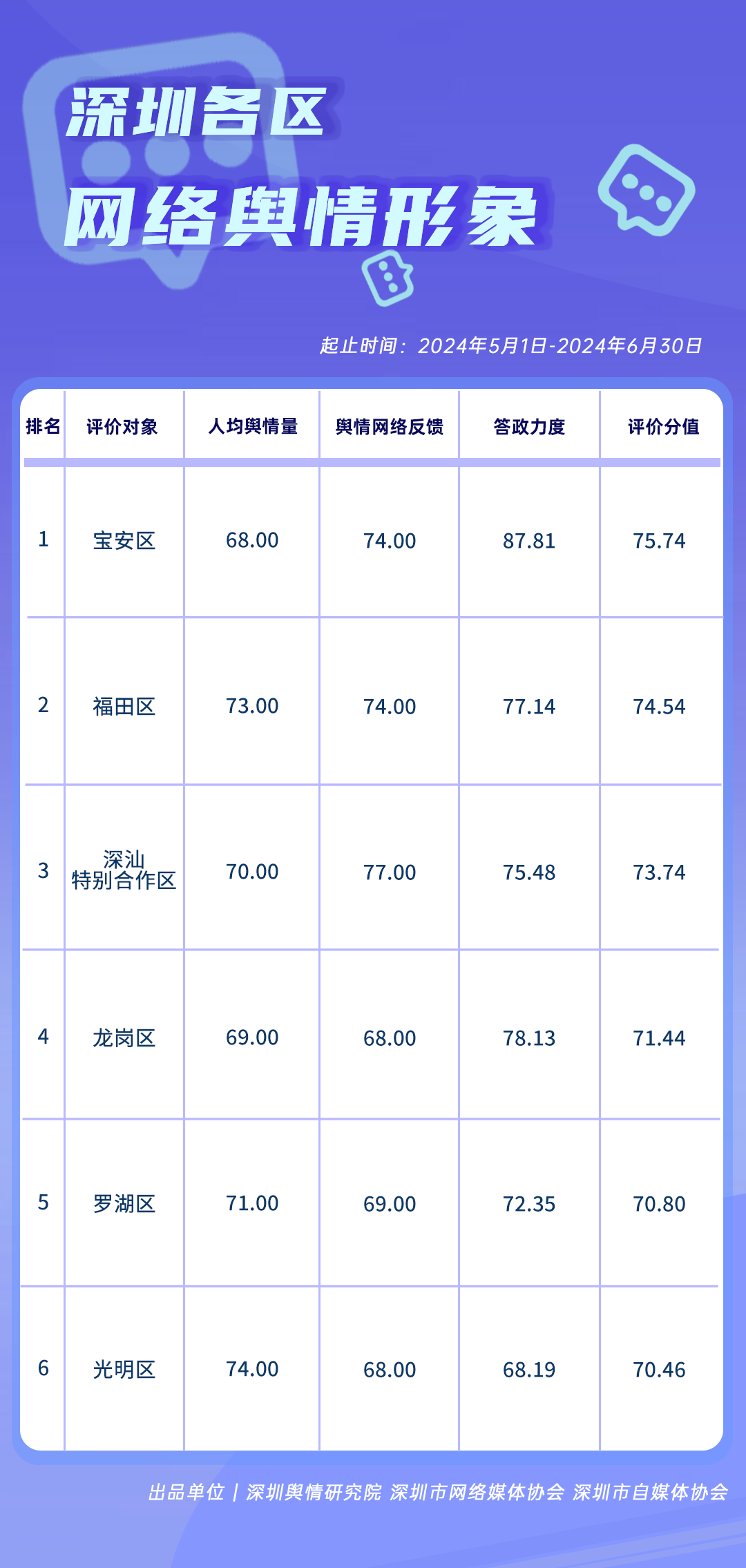 在《深圳各區(qū)網(wǎng)絡(luò)輿情形象榜》中,寶安區(qū)以75.74分的高分榮登榜首,其在答政力度上的表現(xiàn)尤為突出,得分高達(dá)87.81分,這充分展現(xiàn)了寶安區(qū)對網(wǎng)絡(luò)問政工作的重視程度。緊隨其后的是福田區(qū),以74.54分的評價分值位列第二。福田區(qū)在輿情處置相關(guān)的多個評價指標(biāo)上均表現(xiàn)出色,每項指標(biāo)得分均超過73分。深汕特別合作區(qū)、龍崗區(qū)、羅湖區(qū)和光明區(qū)則分別位列第三至第六名。這些區(qū)域同樣展現(xiàn)出對民眾聲音的高度重視,將民意視為改進(jìn)工作的重要參考,并且積極采取措施主動回應(yīng)民眾關(guān)切,體現(xiàn)了其在網(wǎng)絡(luò)輿情管理上的積極態(tài)度和有效策略。