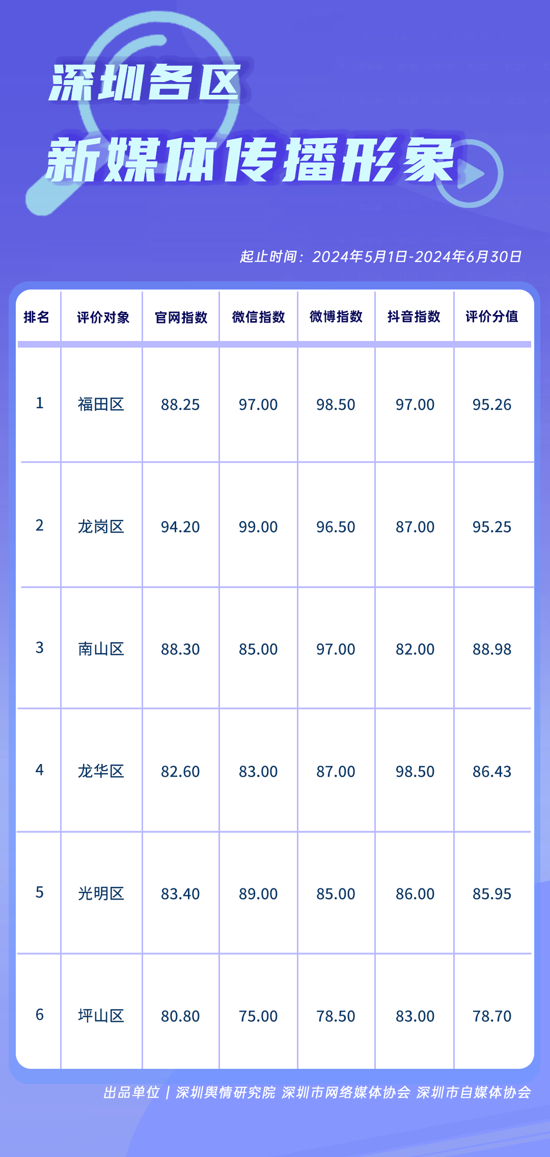5-6月,在《深圳各區(qū)新媒體傳播形象榜》中,福田區(qū)、龍崗區(qū)、南山區(qū)、龍華區(qū)、光明區(qū)、坪山區(qū)均展現(xiàn)了出色的表現(xiàn),成功躋身榜單前六強(qiáng)。其中福田區(qū)、龍崗區(qū)超過95分的高分表現(xiàn)尤為搶眼,反映出兩區(qū)在新媒體傳播上的深度投入和創(chuàng)新實踐。南山區(qū)則以88.98分的成績,榮獲榜單第三名,顯示出其在提升新媒體傳播能力方面的不懈努力。龍華區(qū)、光明區(qū)和坪山區(qū)緊隨其后,分別位列第四至第六名,表明這些區(qū)域同樣在新媒體傳播領(lǐng)域不斷探索和深化工作,尋求創(chuàng)新的方式來提升自身的新媒體形象。整體來看,上榜區(qū)域的新媒體傳播工作不僅提升了信息傳播效率,也為塑造深圳各區(qū)的正面形象做出了積極貢獻(xiàn)。