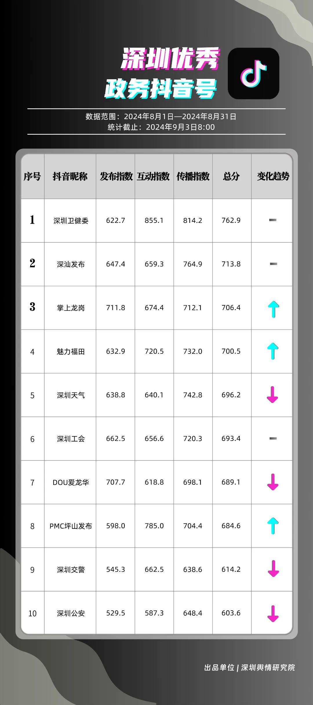 8月,“深圳衛(wèi)健委”“深汕發(fā)布”“掌上龍崗”“魅力福田”“深圳天氣”“深圳工會(huì)”“DOU愛(ài)龍華”“PMC坪山發(fā)布”“深圳交警”和“深圳公安”共10個(gè)政務(wù)抖音號(hào)獲得優(yōu)秀稱號(hào),“深圳衛(wèi)健委”“深汕發(fā)布”“掌上龍崗”以高分居榜單前三,賬號(hào)有關(guān)“醫(yī)師節(jié)”“猴痘”“奧運(yùn)金牌”的視頻獲得了較高的關(guān)注度和討論度,相關(guān)優(yōu)秀視頻在傳播信息的同時(shí),也展現(xiàn)了深圳政務(wù)抖音號(hào)在內(nèi)容質(zhì)量、互動(dòng)性和傳播度方面的實(shí)力。