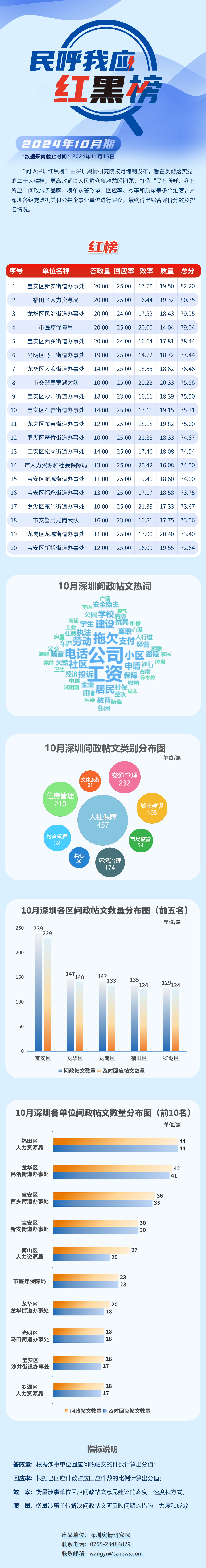 本期榜單采集的帖文主要來(lái)自深圳市及各區(qū)政府官網(wǎng)、深圳論壇、人民網(wǎng)領(lǐng)導(dǎo)留言板、深圳新聞網(wǎng)“民呼我應(yīng)”等平臺(tái),所采集帖文發(fā)布時(shí)間為2024年10月1日至10月31日,采集截止時(shí)間為2024年11月15日。
