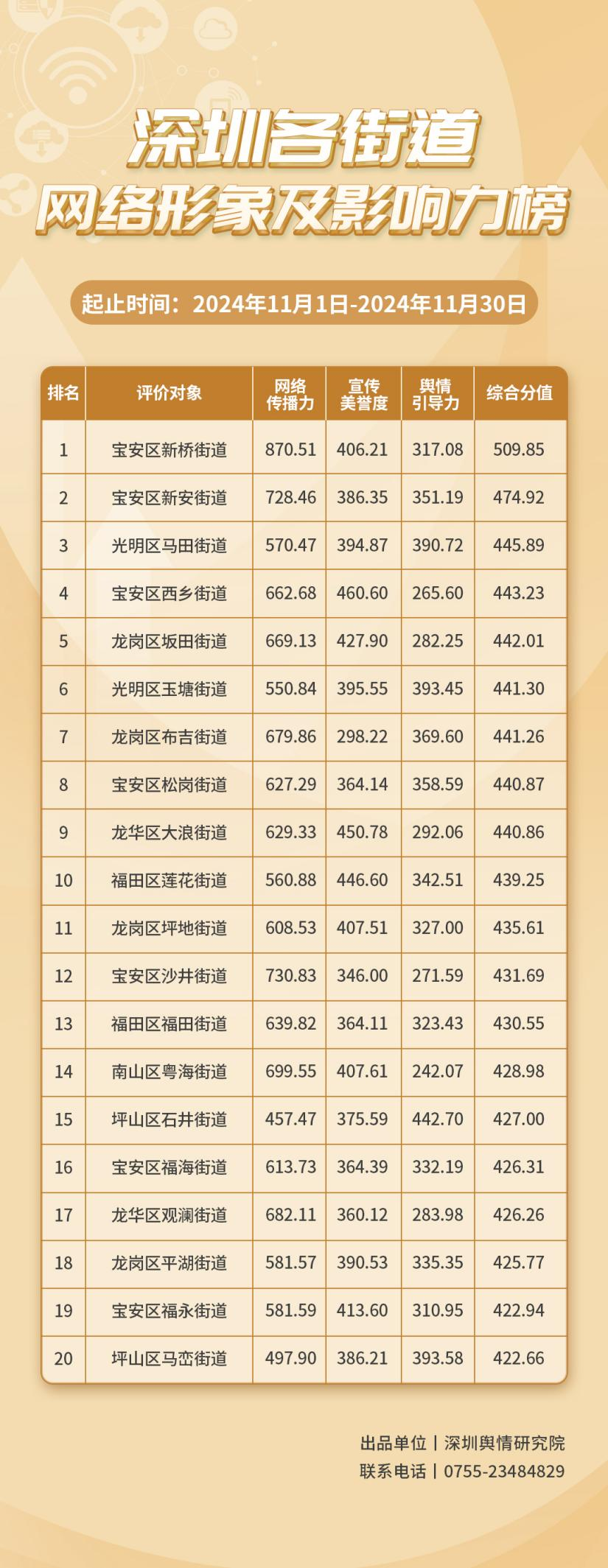 2024年11月,共有20個街道登上《深圳各街道網(wǎng)絡(luò)形象及影響力榜》,分別是:寶安區(qū)新橋街道、寶安區(qū)新安街道、光明區(qū)馬田街道、寶安區(qū)西鄉(xiāng)街道、龍崗區(qū)坂田街道、光明區(qū)玉塘街道、龍崗區(qū)布吉街道、寶安區(qū)松崗街道、龍華區(qū)大浪街道、福田區(qū)蓮花街道、龍崗區(qū)坪地街道、寶安區(qū)沙井街道、福田區(qū)福田街道、南山區(qū)粵海街道、坪山區(qū)石井街道、寶安區(qū)福海街道、龍華區(qū)觀瀾街道、龍崗區(qū)平湖街道、寶安區(qū)福永街道、坪山區(qū)馬巒街道。