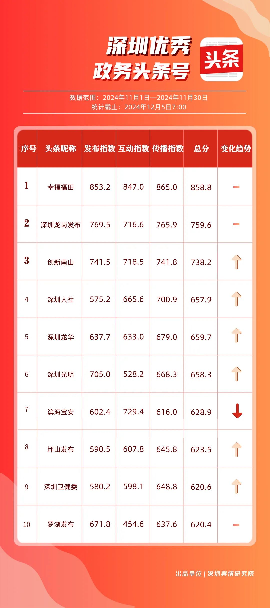 11月,“幸福福田”“深圳龍崗發(fā)布”“創(chuàng)新南山”“深圳人社”“深圳龍華”“深圳光明”“濱海寶安”“坪山發(fā)布”“深圳衛(wèi)健委”“羅湖發(fā)布”共10個(gè)政務(wù)頭條號(hào)入選“優(yōu)秀政務(wù)頭條號(hào)”榜單?!靶腋8L铩卑l(fā)布大量民生相關(guān)信息,穩(wěn)居第一?!吧钲邶垗彴l(fā)布”同樣表現(xiàn)不凡,排名始終位于前列,展現(xiàn)了其在信息傳播與政務(wù)服務(wù)方面的卓越能力。此外,賬號(hào)“創(chuàng)新南山”“深圳人社”“深圳龍華”“深圳光明”在榜單中的排名有所提升,為政務(wù)新媒體樹(shù)立了典范。