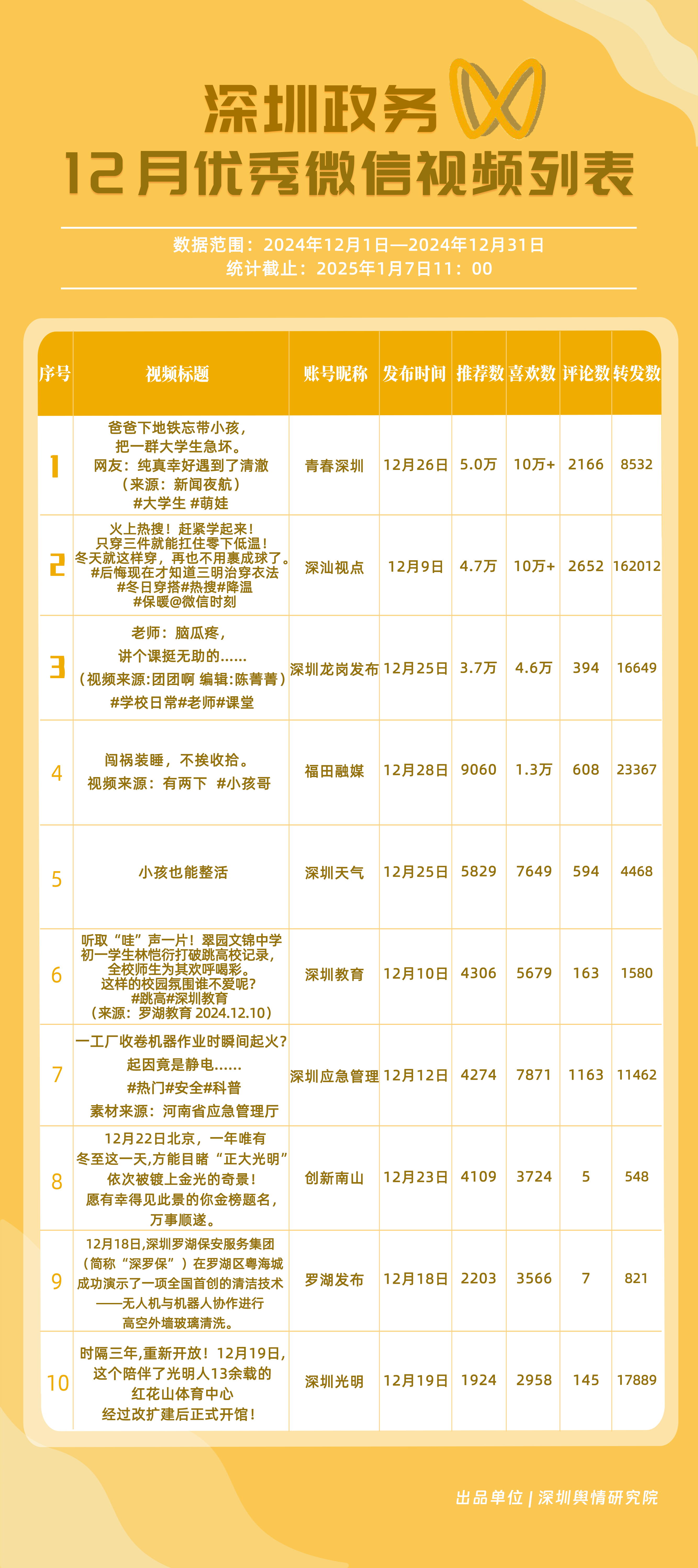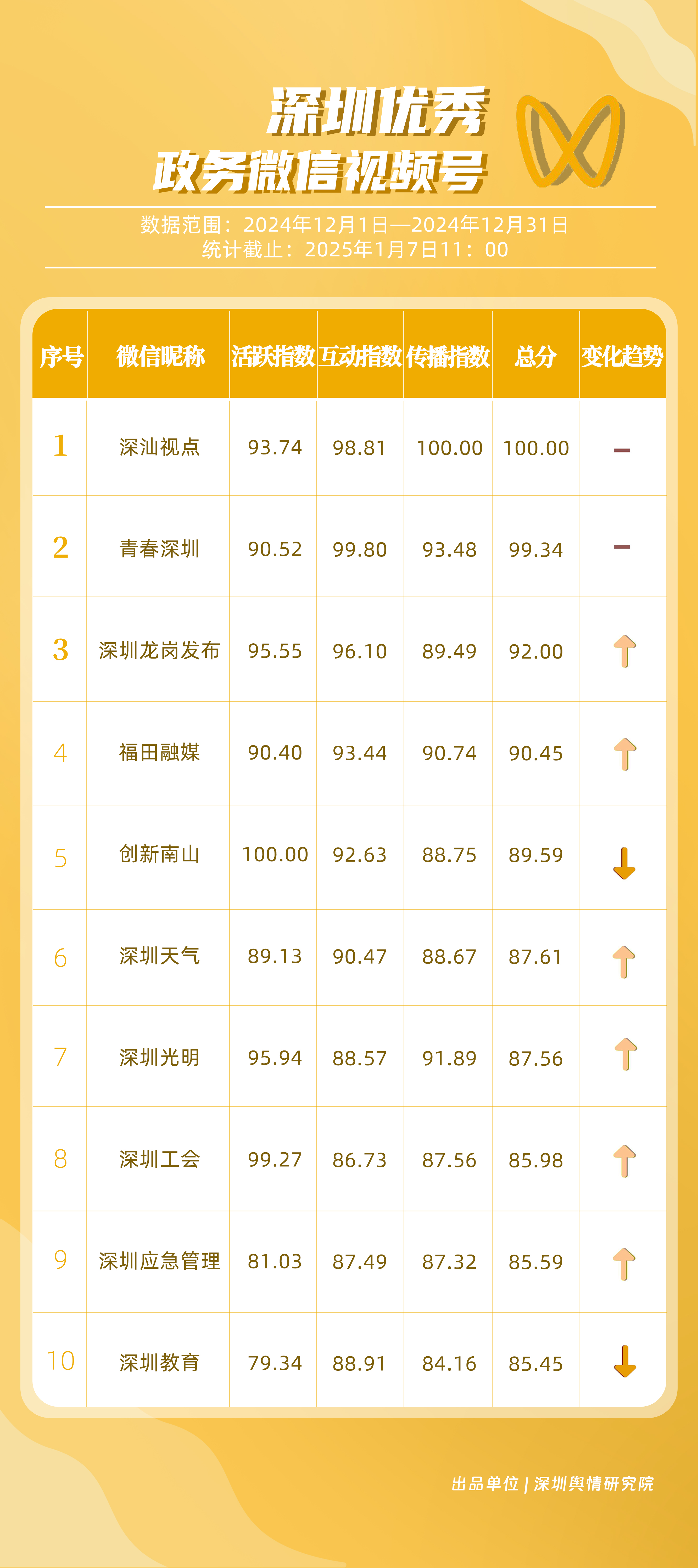 12月,獲“深圳優(yōu)秀政務微信視頻號”稱號的分別是“深汕視點”“青春深圳”“深圳龍崗發(fā)布”“福田融媒”“創(chuàng)新南山”“深圳天氣”“深圳光明”“深圳工會”“深圳應急管理”“深圳教育”。其中,“深汕視點”“青春深圳”在互動方面表現(xiàn)突出,占據(jù)榜單第一、第二位置?!吧钲邶垗彴l(fā)布”活躍、互動指數(shù)位于各政務視頻號前列,排名有所提升?!案L锶诿健比笾笜说梅志?0分以上,位于榜單第四名,充分展現(xiàn)各政務微信視頻號在信息更新、用戶互動以及傳播范圍等方面的卓越能力和持續(xù)進步。