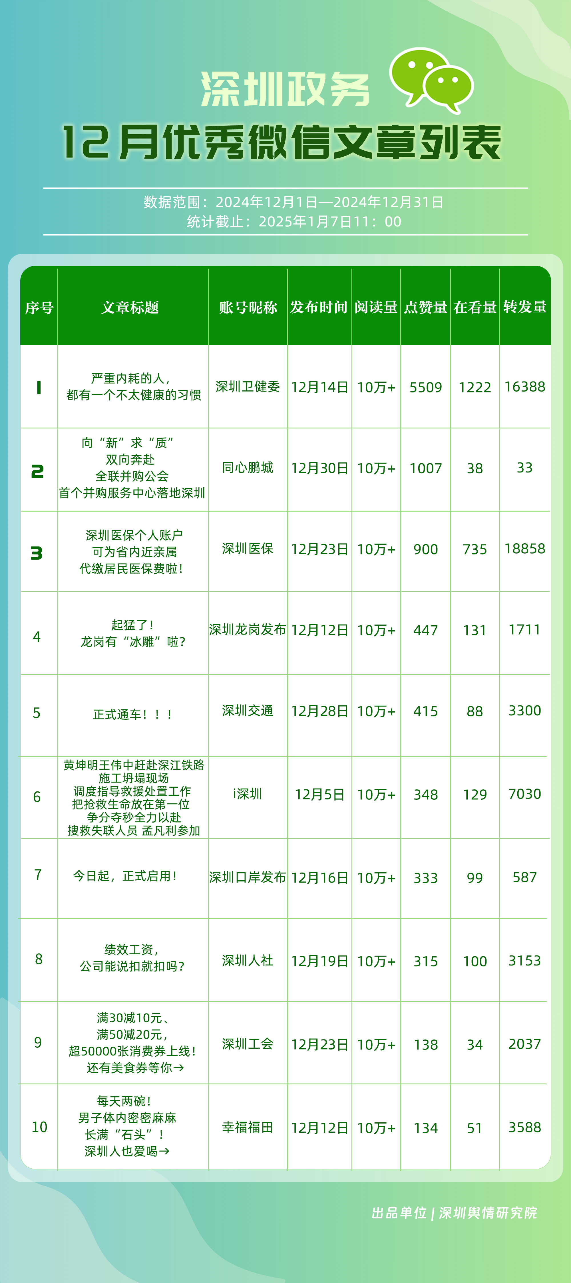 12月,“深圳衛(wèi)健委”“幸福福田”“深圳龍崗發(fā)布”“i深圳”“創(chuàng)新南山”“深圳光明”“濱海寶安”“青春深圳”“羅湖發(fā)布”“深圳龍華”等30個賬號入選“深圳優(yōu)秀政務微信公眾號”。其中,“深圳衛(wèi)健委”位于榜單首位,總分為100分。“幸福福田”“深圳光明”“濱海寶安”“羅湖發(fā)布”排名在本期有所提升,展現(xiàn)了他們不斷提升的傳播力、影響力?!癷深圳”“創(chuàng)新南山”則保持了穩(wěn)定的排名,持續(xù)在政務信息宣傳中發(fā)揮著重要作用。