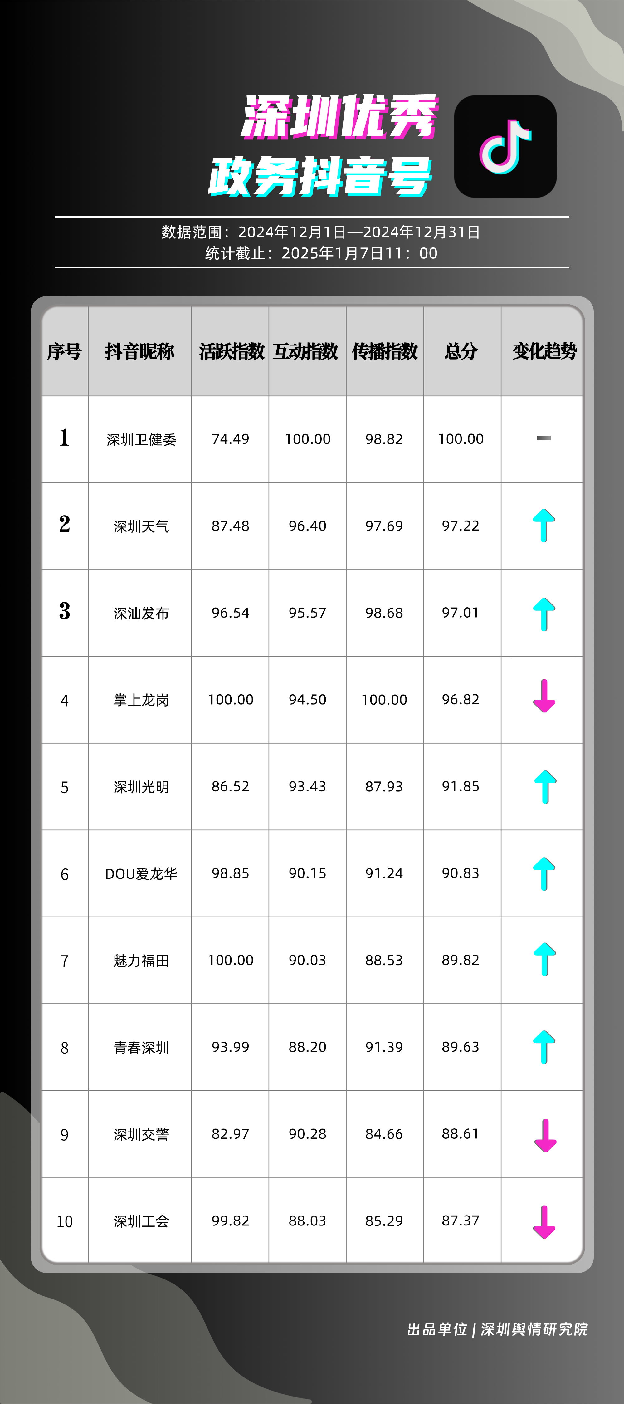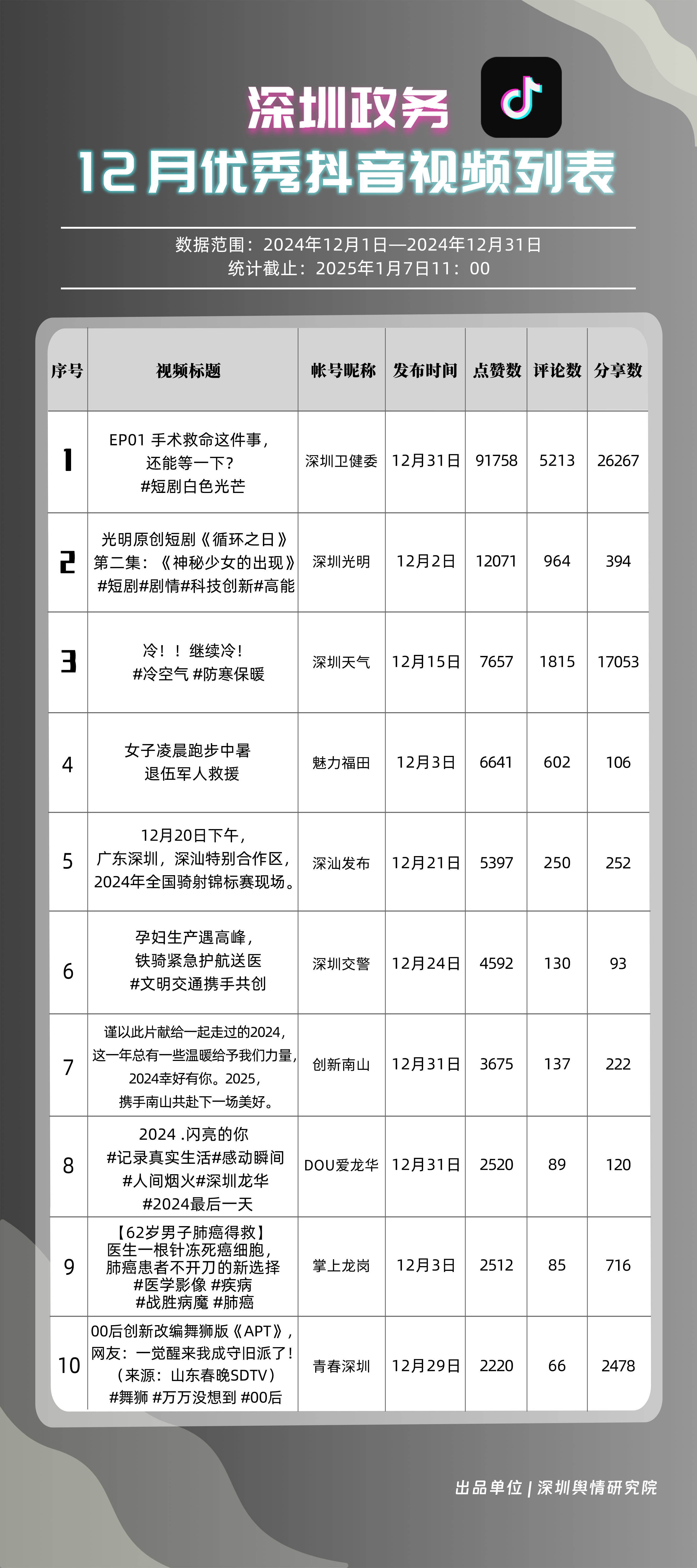 12月,“深圳衛(wèi)健委”“深圳天氣”“深汕發(fā)布”“掌上龍崗”“深圳光明”“DOU愛龍華”“魅力福田”“青春深圳”“深圳交警”“深圳工會”共10個政務抖音號獲得“深圳優(yōu)秀政務抖音號”稱號?!吧钲谛l(wèi)健委”在互動、傳播方面成績優(yōu)異,助推其位于榜單首位?!吧钲谔鞖狻薄吧钌前l(fā)布”“掌上龍崗”則各有所長,綜合排名位于榜單前列,內容產出豐富、用戶互動高頻,信息傳播廣泛,共同展現(xiàn)了政務抖音號在服務公眾、提升信息傳播效能方面的顯著效能。