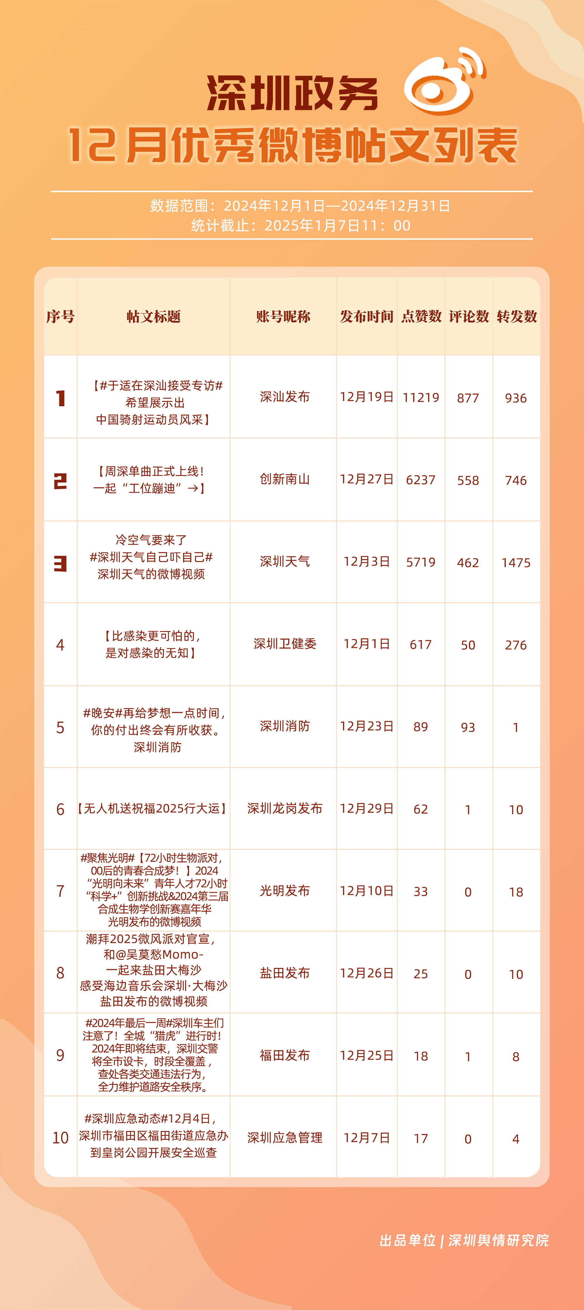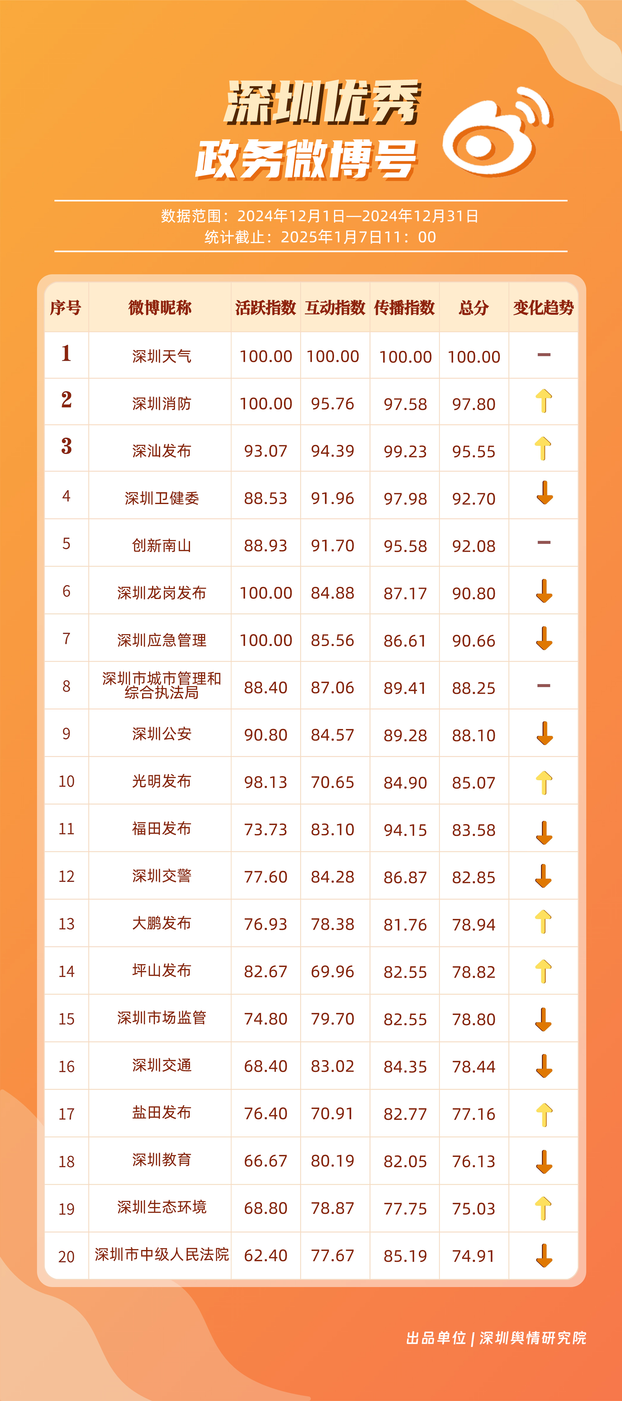 12月,“深圳天氣”“深圳消防”“深汕發(fā)布”“深圳衛(wèi)健委”“創(chuàng)新南山”“深圳龍崗發(fā)布”“深圳應急管理”“深圳市城市管理和綜合執(zhí)法局”“深圳公安”“光明發(fā)布”等20個賬號入選“優(yōu)秀政務微博號”?!吧钲谔鞖狻鲍@得滿分,“深圳消防”“深汕發(fā)布”賬號總分均超95分,位于榜單前三名。同時,“深圳衛(wèi)健委”“創(chuàng)新南山”“深圳龍崗發(fā)布”及“深圳應急管理”等賬號憑借對熱點的敏銳捕捉與信息的及時發(fā)布,總分在90分以上,體現(xiàn)出各自在提升公眾信息獲取質量方面的不懈努力,彰顯了政務微博賬號在政民連接、信息共享等方面的巨大價值。