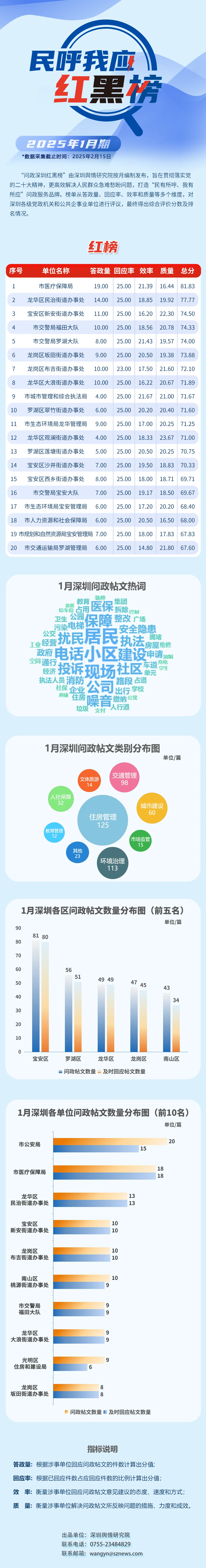 2025年1月,共有20家單位因積極解決民生問題,認真細致答政,登上“紅榜”,它們分別是:市醫(yī)療保障局、龍華區(qū)民治街道辦事處、寶安區(qū)新安街道辦事處、市交警局福田大隊、市交警局羅湖大隊、龍崗區(qū)坂田街道辦事處、龍崗區(qū)布吉街道辦事處、龍華區(qū)大浪街道辦事處、市城市管理和綜合執(zhí)法局、羅湖區(qū)翠竹街道辦事處、市生態(tài)環(huán)境局龍華管理局、龍華區(qū)觀瀾街道辦事處、羅湖區(qū)蓮塘街道辦事處、寶安區(qū)沙井街道辦事處、寶安區(qū)西鄉(xiāng)街道辦事處、市交警局寶安大隊、市生態(tài)環(huán)境局寶安管理局、市人力資源和社會保障局、市規(guī)劃和自然資源局寶安管理局、市交通運輸局羅湖管理局。