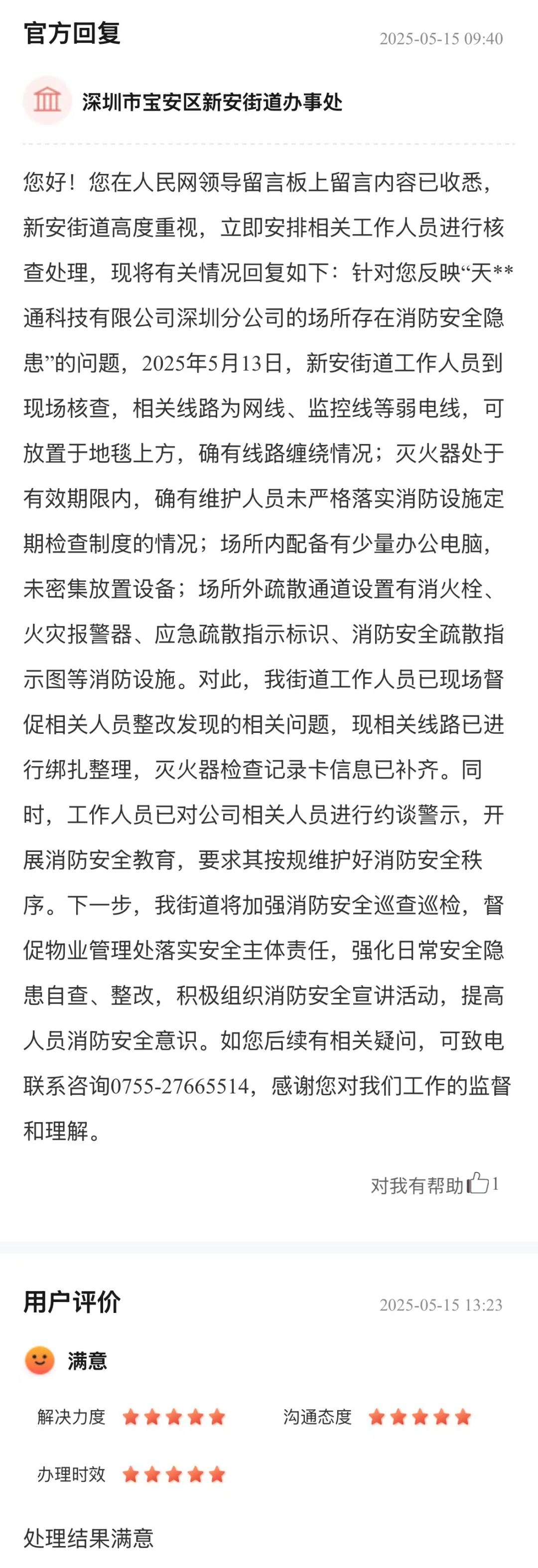 企業(yè)電氣線路混亂、滅火器維護(hù)缺位等消防隱患,直接威脅員工生命財(cái)產(chǎn)安全,更潛藏重大事故風(fēng)險(xiǎn)。街道辦收到市民反饋后,迅速核查并高效解決現(xiàn)存問題,以“即知即改”的行動(dòng)力回應(yīng)群眾關(guān)切。后續(xù)通過約談警示、安全宣教等舉措,從“治已病”轉(zhuǎn)向“防未病”,切實(shí)筑牢區(qū)域消防安全屏障,展現(xiàn)基層對(duì)安全隱患的快速治理能力,傳遞出“民生安全無小事”的責(zé)任擔(dān)當(dāng),獲得網(wǎng)民的五星好評(píng)。