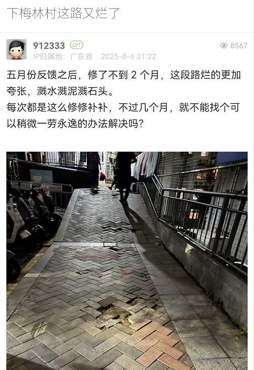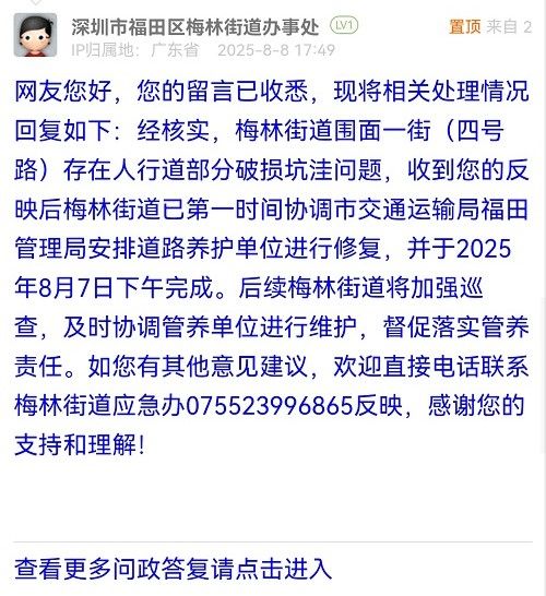 網(wǎng)友您好,您的留言已收悉,現(xiàn)將相關處理情況回復如下:經(jīng)核實,梅林街道圍面一街(四號路)存在人行道部分破損坑洼問題,收到您的反映后梅林街道已第一時間協(xié)調(diào)市交通運輸局福田管理局安排道路養(yǎng)護單位進行修復,并于2025年8月7日下午完成。后續(xù)梅林街道將加強巡查,及時協(xié)調(diào)管養(yǎng)單位進行維護,督促落實管養(yǎng)責任。如您有其他意見建議,歡迎直接電話聯(lián)系梅林街道應急辦075523996865反映,感謝您的支持和理解!
