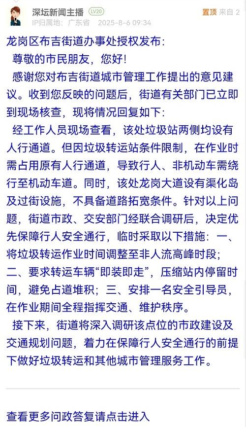 經(jīng)工作人員現(xiàn)場查看,該處垃圾站兩側(cè)均設有人行通道。但因垃圾轉(zhuǎn)運站條件限制,在作業(yè)時需占用原有人行通道,導致行人、非機動車需繞行至機動車道。同時,該處龍崗大道設有渠化島及過街設施,不具備道路拓寬條件。針對以上問題,街道市政、交安部門經(jīng)聯(lián)合調(diào)研后,決定優(yōu)先保障行人安全通行,臨時采取以下措施:一、將垃圾轉(zhuǎn)運作業(yè)時間調(diào)整至非人流高峰時段;二、要求轉(zhuǎn)運車輛“即裝即走”,壓縮站內(nèi)停留時間,避免占道堆積;三、安排一名安全引導員,在作業(yè)期間全程指揮交通、維護秩序。