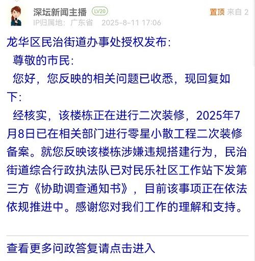 經(jīng)核實,該樓棟正在進行二次裝修,2025年7月8日已在相關部門進行零星小散工程二次裝修備案。就您反映該樓棟涉嫌違規(guī)搭建行為,民治街道綜合行政執(zhí)法隊已對民樂社區(qū)工作站下發(fā)第三方《協(xié)助調(diào)查通知書》,目前該事項正在依法依規(guī)推進中。感謝您對我們工作的理解和支持。
