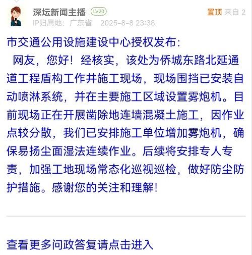 網(wǎng)友,您好!經(jīng)核實,該處為僑城東路北延通道工程盾構(gòu)工作井施工現(xiàn)場,現(xiàn)場圍擋已安裝自動噴淋系統(tǒng),并在主要施工區(qū)域設置霧炮機。目前現(xiàn)場正在開展鑿除地連墻混凝土施工,因作業(yè)點較分散,我們已安排施工單位增加霧炮機,確保易揚塵面濕法連續(xù)作業(yè)。后續(xù)將安排專人專責,加強工地現(xiàn)場常態(tài)化巡視巡檢,做好防塵防護措施。感謝您的關注和理解!