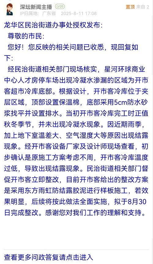 經(jīng)民治街道相關部門現(xiàn)場核實,星河環(huán)球商業(yè)中心人才房停車場出現(xiàn)冷凝水滲漏的區(qū)域為開市客超市冷庫底部。根據(jù)設計,開市客冷庫位于夾層區(qū)域,頂部設置保溫棉,底部采用5cm防水砂漿找平并設置排水。當初開市客冷庫完工時正值秋冬季節(jié),并未出現(xiàn)冷凝水現(xiàn)象。因近期雨季,加上地下室溫差大、空氣濕度大等原因出現(xiàn)結(jié)露現(xiàn)象。經(jīng)開市客設備廠家及設計師現(xiàn)場查看,初步確認是原施工方案考慮不周,開市客冷庫溫度過低,導致出現(xiàn)結(jié)露現(xiàn)象。民治街道相關部門督促開市客立即整改,目前開市客給出的整改方案是采用東方雨虹防結(jié)露膠泥進行樣板施工,若效果明顯,后續(xù)將按此做法全面實施,擬于8月30日完成整改。感謝您對我們工作的理解和支持。