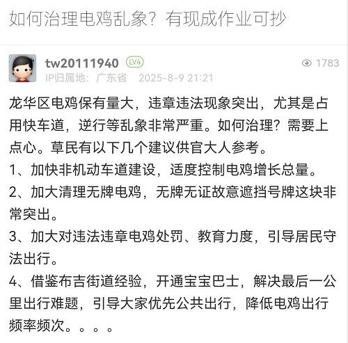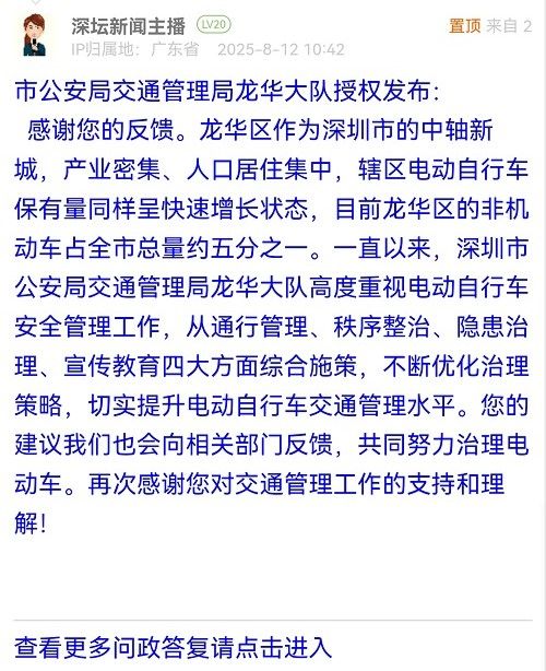 感謝您的反饋。龍華區(qū)作為深圳市的中軸新城,產(chǎn)業(yè)密集、人口居住集中,轄區(qū)電動自行車保有量同樣呈快速增長狀態(tài),目前龍華區(qū)的非機動車占全市總量約五分之一。一直以來,深圳市公安局交通管理局龍華大隊高度重視電動自行車安全管理工作,從通行管理、秩序整治、隱患治理、宣傳教育四大方面綜合施策,不斷優(yōu)化治理策略,切實提升電動自行車交通管理水平。您的建議我們也會向相關部門反饋,共同努力治理電動車。再次感謝您對交通管理工作的支持和理解!