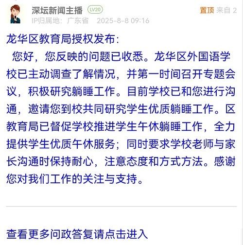 您好,您反映的問題已收悉。龍華區(qū)外國語學校已主動調(diào)查了解情況,并第一時間召開專題會議,積極研究躺睡工作。目前學校已和您進行溝通,邀請您到校共同研究學生優(yōu)質(zhì)躺睡工作。區(qū)教育局已督促學校推進學生午休躺睡工作,全力提供學生優(yōu)質(zhì)午休服務;同時要求學校老師與家長溝通時保持耐心,注意態(tài)度和方式方法。感謝您對我們工作的關注與支持。