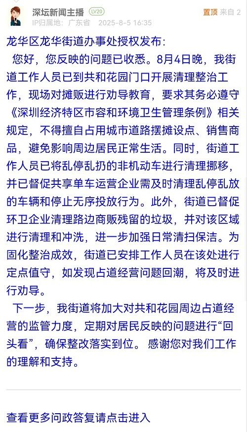 您好,您反映的問題已收悉。8月4日晚,我街道工作人員已到共和花園門口開展清理整治工作,現(xiàn)場對攤販進行勸導教育,要求其務必遵守《深圳經(jīng)濟特區(qū)市容和環(huán)境衛(wèi)生管理條例》相關規(guī)定,不得擅自占用城市道路擺攤設點、銷售商品,避免影響周邊居民正常生活。同時,街道工作人員已將亂停亂扔的非機動車進行清理挪移,并已督促共享單車運營企業(yè)需及時清理亂停亂放的車輛和停止無序投放行為。此外,街道已督促環(huán)衛(wèi)企業(yè)清理路邊商販殘留的垃圾,并對該區(qū)域進行清理和沖洗,進一步加強日常清掃保潔。為固化整治成效,街道已安排工作人員在該處進行定點值守,如發(fā)現(xiàn)占道經(jīng)營問題回潮,將及時進行勸導。