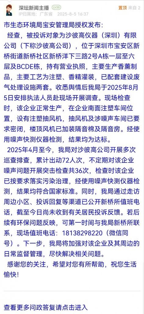 經(jīng)查,被投訴對象為沙彼高儀器(深圳)有限公司(下稱沙彼高公司),位于深圳市寶安區(qū)新橋街道新橋社區(qū)新橋洋下三路2號A棟一層至六層及BCDE棟,持有營業(yè)執(zhí)照,主要生產(chǎn)香薰制品,主要工藝為注塑、香精灌裝,已配套建設廢氣處理設施兩套。收悉輿情后我局于2025年8月5日安排執(zhí)法人員赴現(xiàn)場開展調(diào)查?,F(xiàn)場檢查時,該企業(yè)正常生產(chǎn),在企業(yè)南面注塑車間位置,設有注塑抽風機,抽風機及涉噪聲車間已要求密閉,樓頂風機已加裝隔音棉及隔音房。經(jīng)使用噪聲快測儀器檢測,結(jié)果均為達標。