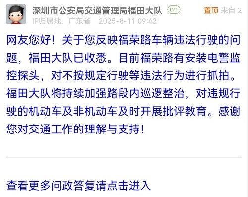 網(wǎng)友您好!關于您反映福榮路車輛違法行駛的問題,福田大隊已收悉。目前福榮路有安裝電警監(jiān)控探頭,對不按規(guī)定行駛等違法行為進行抓拍。福田大隊將持續(xù)加強路段內(nèi)巡邏整治,對違規(guī)行駛的機動車及非機動車及時開展批評教育。感謝您對交通工作的理解與支持!