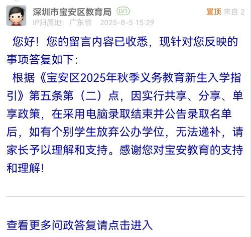 根據(jù)《寶安區(qū)2025年秋季義務教育新生入學指引》第五條第(二)點,因?qū)嵭泄蚕?、分享、單享政策,在采用電腦錄取結(jié)束并公告錄取名單后,如有個別學生放棄公辦學位,無法遞補,請家長予以理解和支持。感謝您對寶安教育的支持和理解!