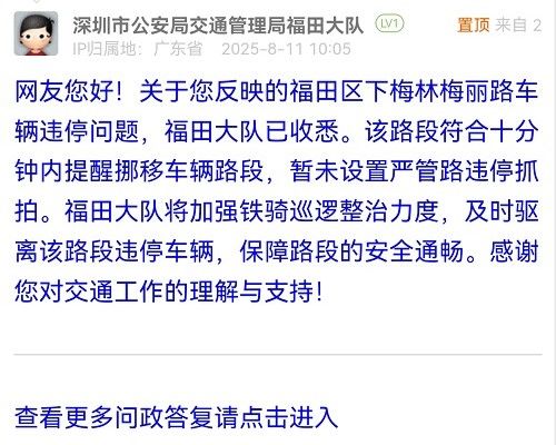 網(wǎng)友您好!關于您反映的福田區(qū)下梅林梅麗路車輛違停問題,福田大隊已收悉。該路段符合十分鐘內(nèi)提醒挪移車輛路段,暫未設置嚴管路違停抓拍。福田大隊將加強鐵騎巡邏整治力度,及時驅(qū)離該路段違停車輛,保障路段的安全通暢。感謝您對交通工作的理解與支持!