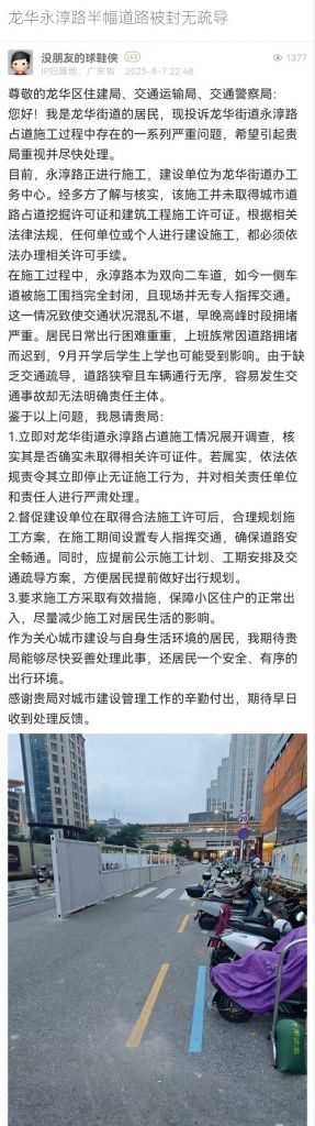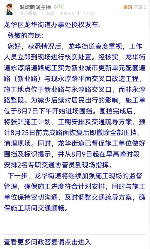 您好,獲悉情況后,龍華街道高度重視,工作人員立即到現(xiàn)場進行核實處置。經(jīng)核實,龍華街道永淳路道路施工實為新業(yè)城市更新單元配套道路(新業(yè)路)與現(xiàn)永淳路平面交叉口改造工程,施工地點位于新業(yè)路與永淳路交叉口,而非永淳路整段。為減少后續(xù)對居民出行的影響,施工單位于8月7日下午開始進場圍擋。圍擋完成后,將張貼施工計劃、工期安排及交通疏導方案,預計8月25日前完成路面恢復后即撤除全部圍擋、清理現(xiàn)場。同時,龍華街道已督促施工單位做好圍擋及標識提示,并從8月9日起在早高峰時段安排2名專職交通協(xié)管員到現(xiàn)場指揮。