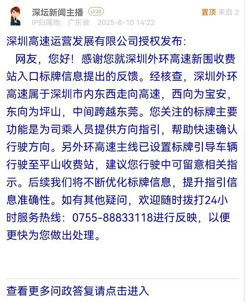 網(wǎng)友,您好!感謝您就深圳外環(huán)高速新圍收費站入口標牌信息提出的反饋。經(jīng)核查,深圳外環(huán)高速屬于深圳市內(nèi)東西走向高速,西向為寶安,東向為坪山,中間跨越東莞。您關注的標牌主要功能是為司乘人員提供方向指引,幫助快速確認行駛方向。另外環(huán)高速主線已設置標牌引導車輛行駛至平山收費站,建議您行駛中可留意相關指示。后續(xù)我們將不斷優(yōu)化標牌信息,提升指引信息準確性。如有其他疑問,歡迎隨時撥打24小時服務熱線:0755-88833118進行反映,以便更快為您做出處理。